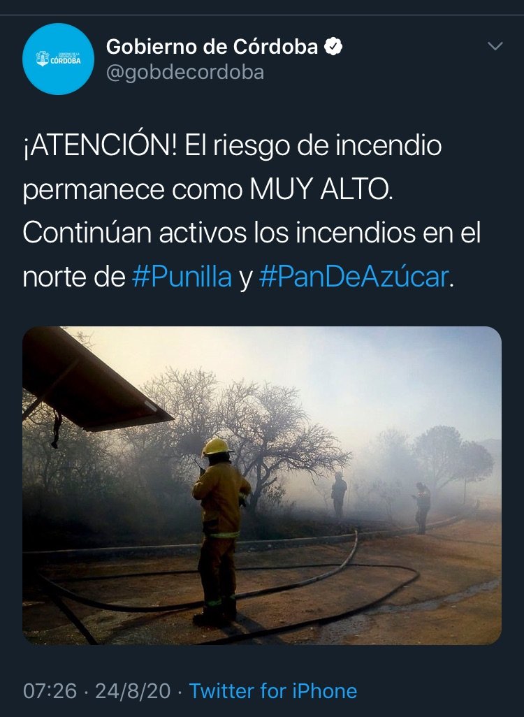 El Gobierno cordobés reiteró que «las condiciones climáticas extremas dificultan el trabajo del personal de bomberos que son atrapados por el fuego. No hay humedad en el ambiente, la vegetación de la zona (monte serrano, palmeras y pastizal) está totalmente seca y con ráfagas de viento del sector norte».