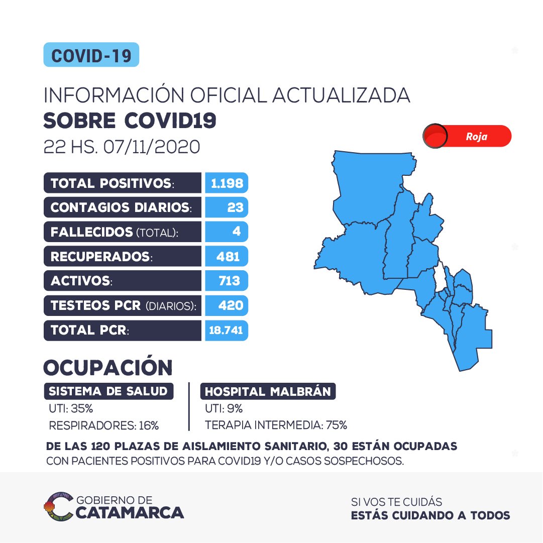 Hasta las 22 horas del sábado 7 de noviembre, se han detectado 23 nuevos casos positivos de coronavirus en la provincia de Catamarca. El total acumulado de casos positivos detectados asciende a 1.198.