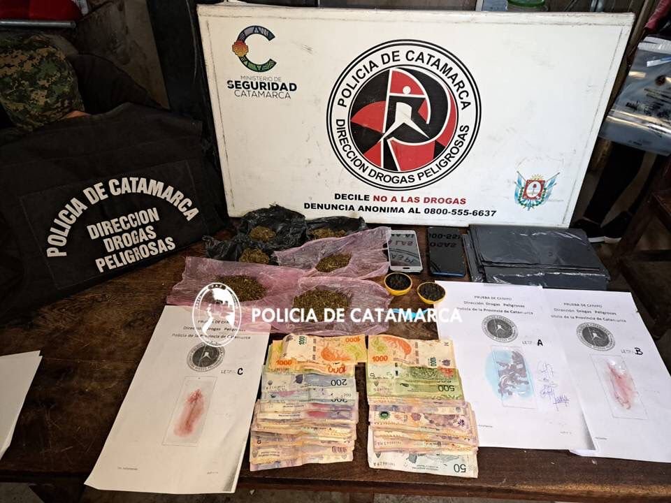 Durante las medidas Judiciales, los policías secuestraron veintitrés dosis de Cocaína, 300 Gr. de Marihuana, fraccionada en dosis de 25 Gr., cuatro teléfonos celulares utilizados para concretar las ventas, la suma de $134.500 en efectivo, discriminados en billetes de baja denominación, junto a elementos relacionados con este tipo de ilícitos, como recortes de plástico y trituradores de Marihuana, que sirven para la elaboración de las dosis de la droga.