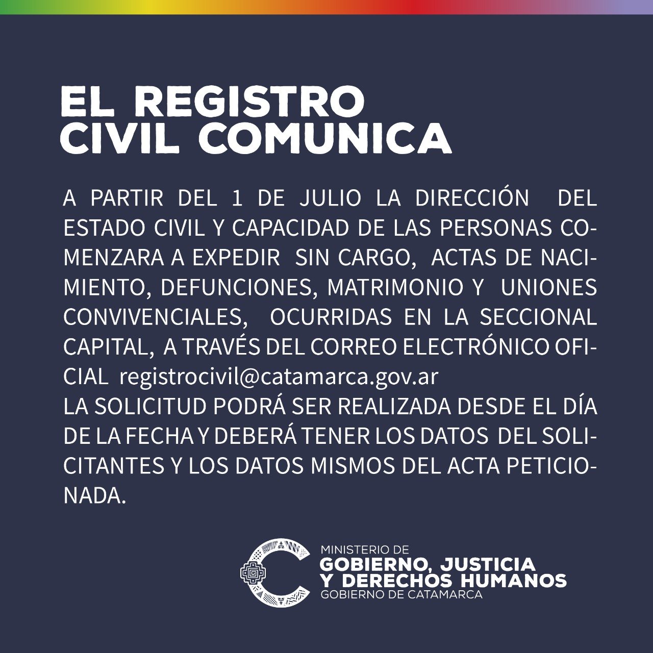 La Dirección del Estado Civil y Capacidad de las Personas, dependiente del Ministerio de Gobierno, Justicia y Derechos Humanos de la Provincia, informa que a partir del 1 de Julio del corriente año se expedirán gratuitamente y a través del correo electrónico digital (registrocivil@catamarca.gov.ar) partidas de nacimiento, fallecimiento, matrimonio y uniones convivenciales ocurridas en la seccional de Capital.